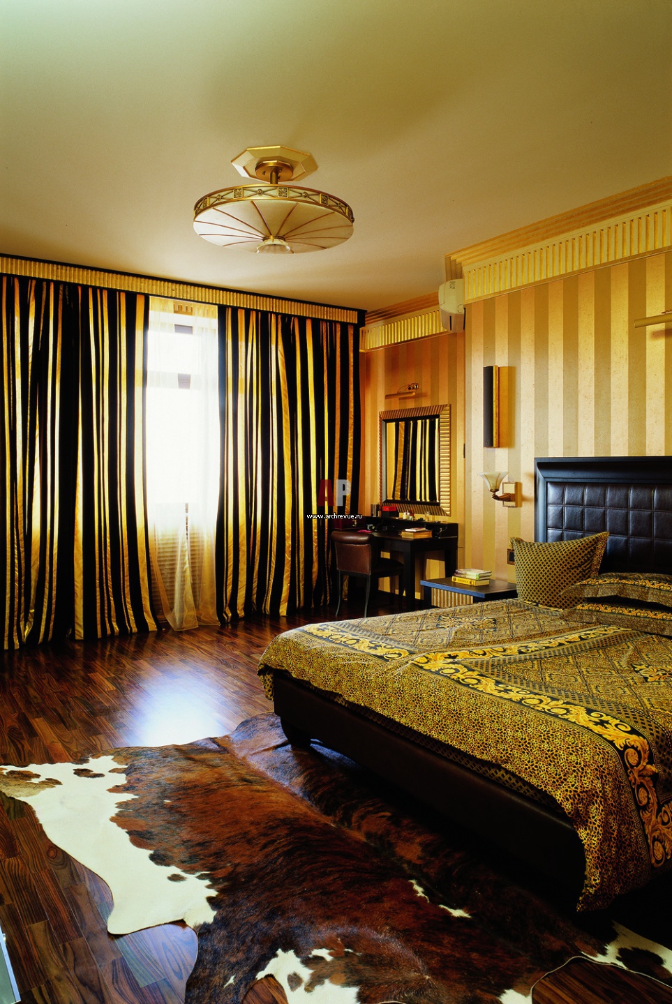 Фото интерьера спальни квартиры в стиле ар-деко. Кровать с кожаным изголовьем Smania.