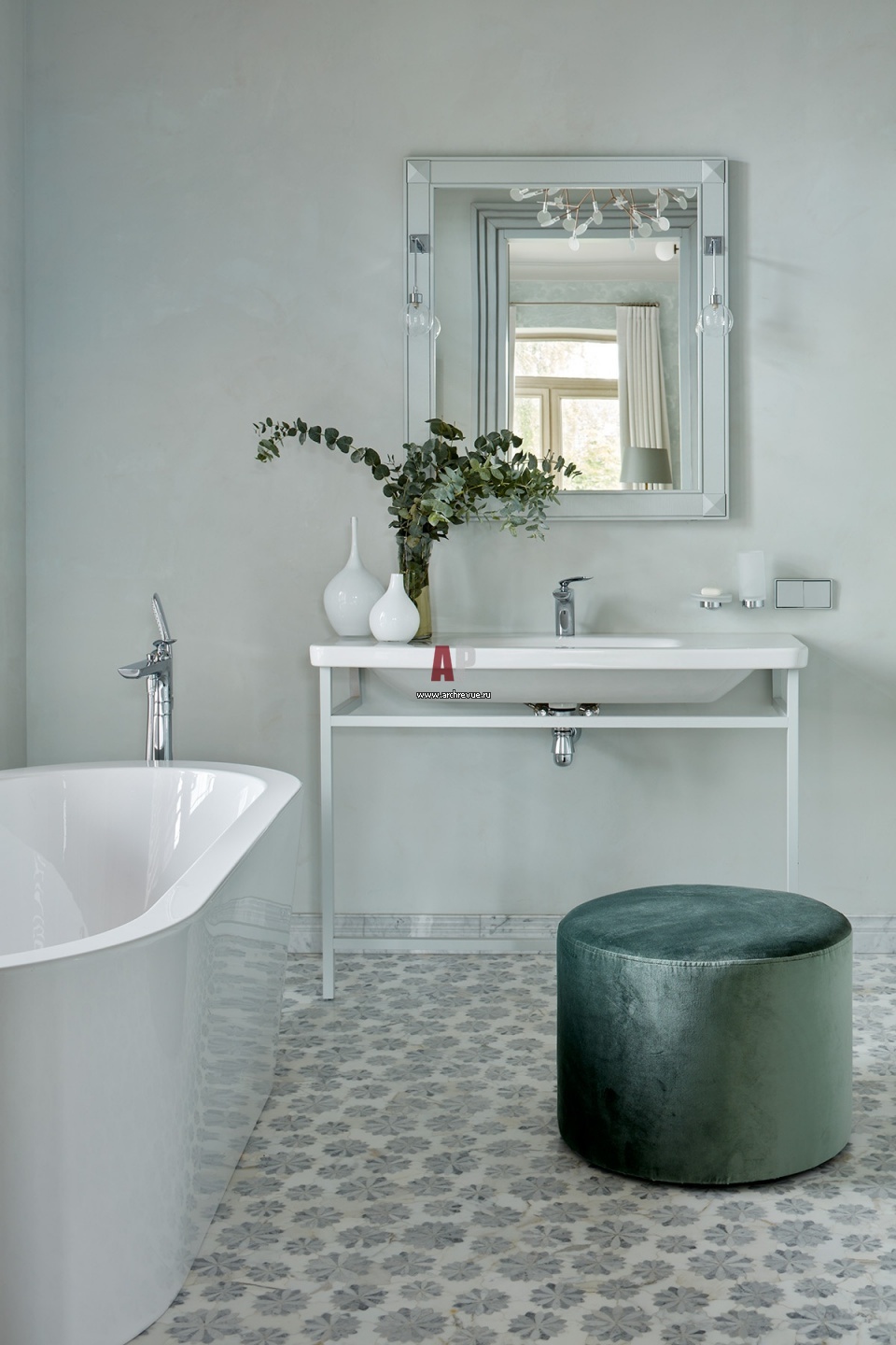 Интерьер ванной комнаты в жемчужно-серых тонах. Пол ванной выложен мозаикой, на стенах – микроцемент.