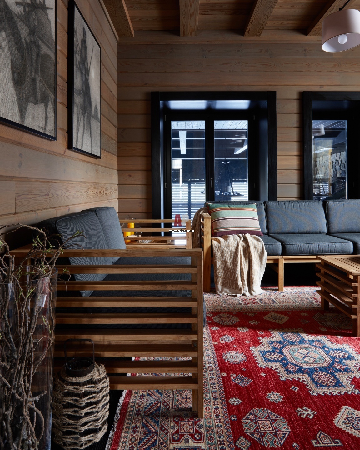 Интерьер деревянного дома в поселке «Нахабино Кантри». Комната отдыха при бассейне.