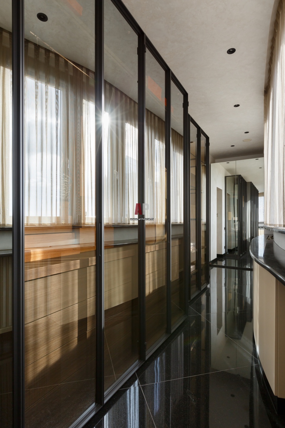 Примыкающую к спальне криволинейную лоджию утеплили и превратили в дополнительную гардеробную. Раздвижные двери, Longhi.