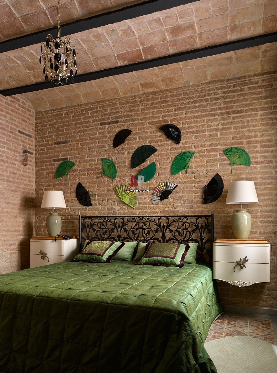 Главный акцент хозяйской спальни – изумрудно-зеленый текстиль и коллекция вееров над изголовьем кровати.