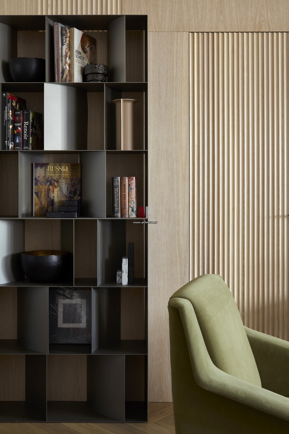 Панели выполнены из светлого дуба, часть из них имеет рисунок – бороздки с графичным ритмом.