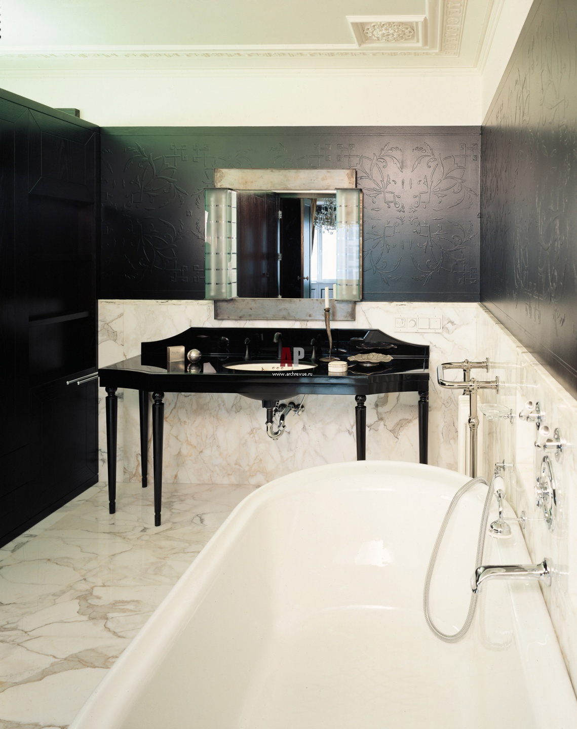 Между санузлом и спальней сделана раздвижная перегородка из дерева. Она изготовлена по индивидуальному проекту. Пол и низ стен отделан плитами мрамора. Сантехника, Kohler.