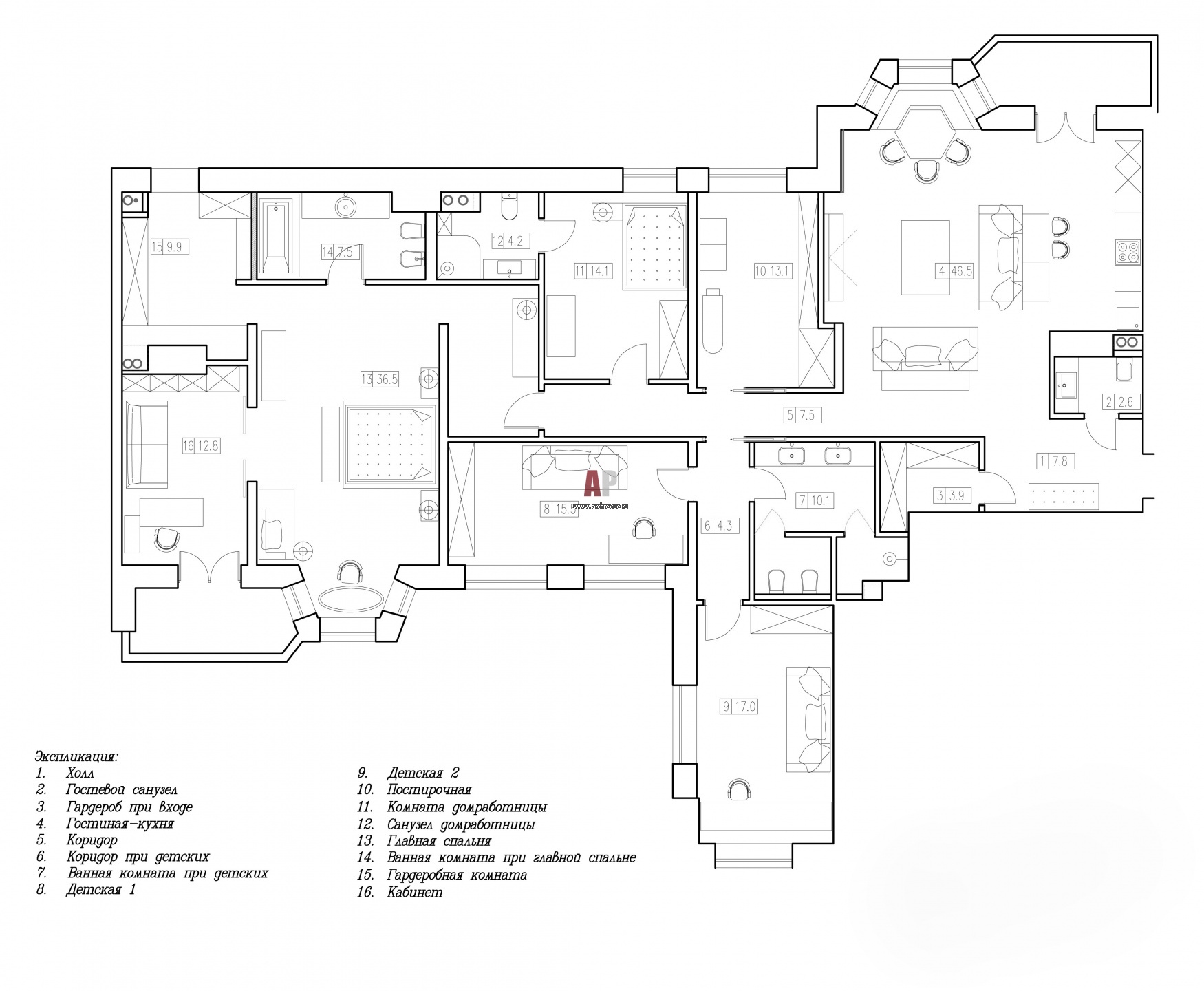 План семейной 5-ти комнатной квартиры на Мосфильмовской улице. Общая площадь – 200 кв. м.