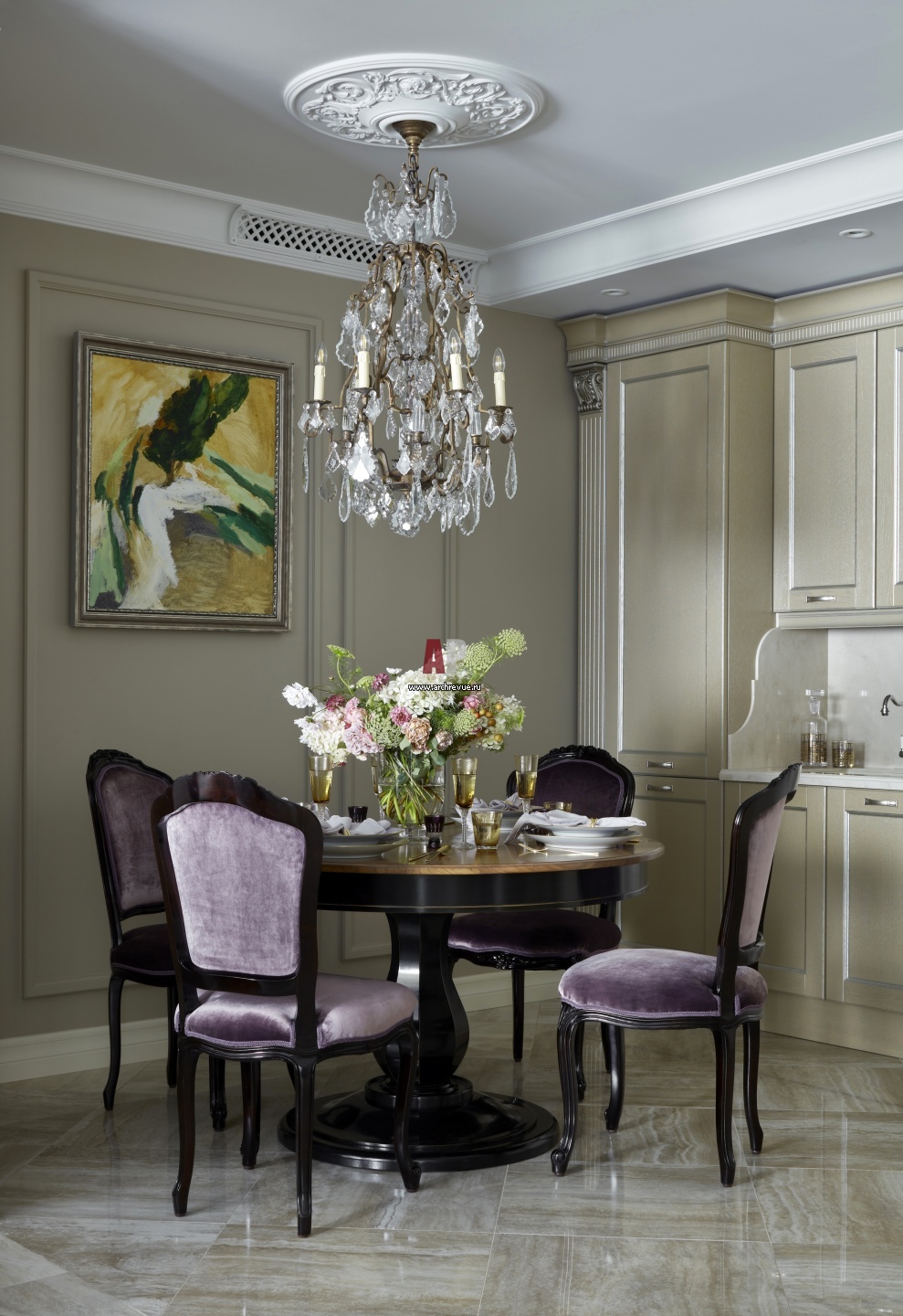 Парадная обеденная зона. Круглый стол, AM Classic. Стулья, Galimberti Nino. Люстра, Eichholtz. На стене картина Валерия Песина.