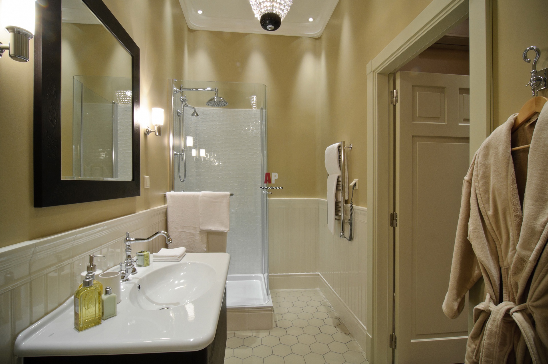 Гостевой санузел в стиле неоклассика с душевой кабиной. Низ стен облицован белыми керамическими панелями Original Style.