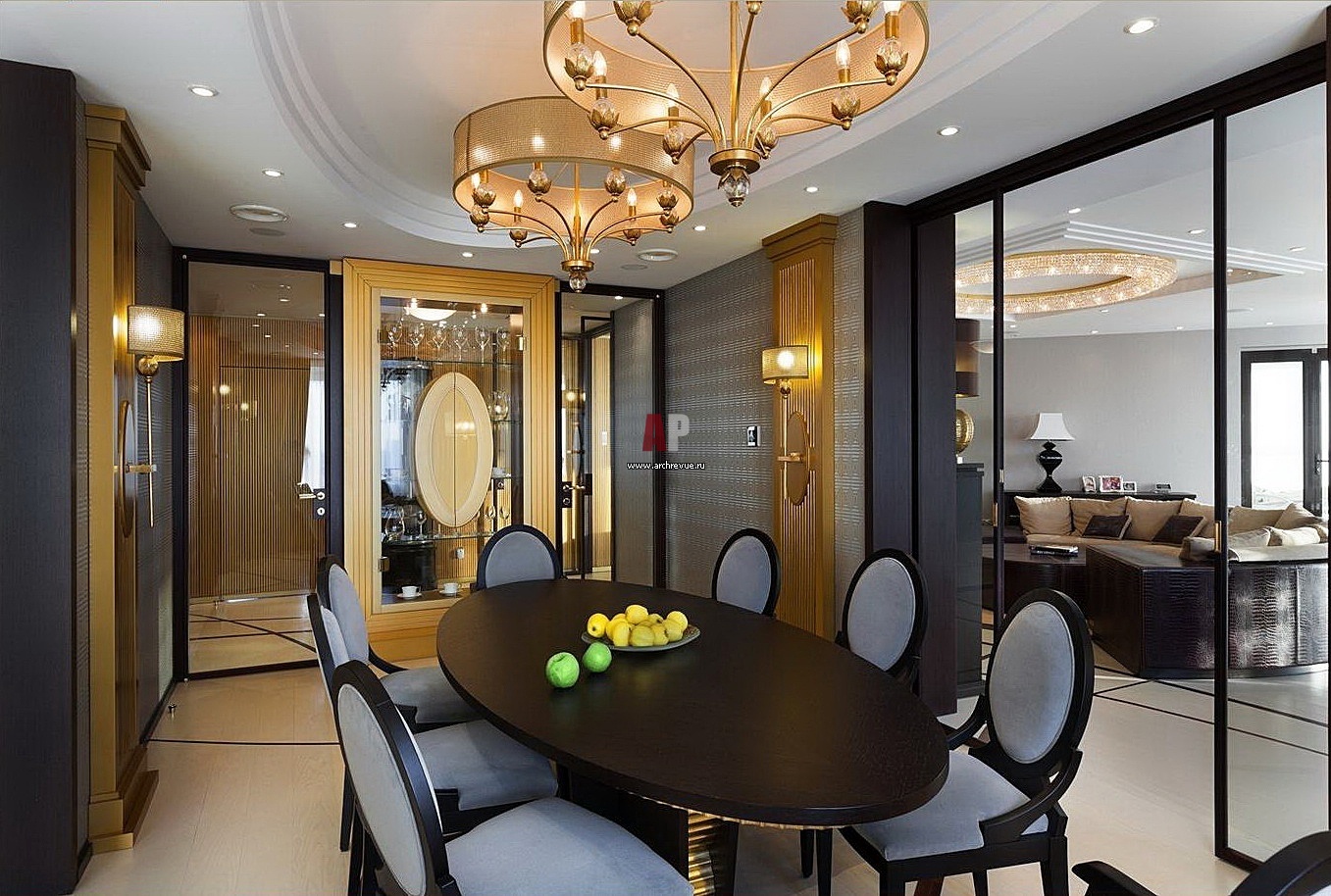 Интерьер столовой выполнен в стиле ар-деко. Стеклянная перегородка справа отрывает вид на гостиную, прозрачные двери вокруг золотого серванта ведут в холл. Светильники над столом, бра, Sigma L2.