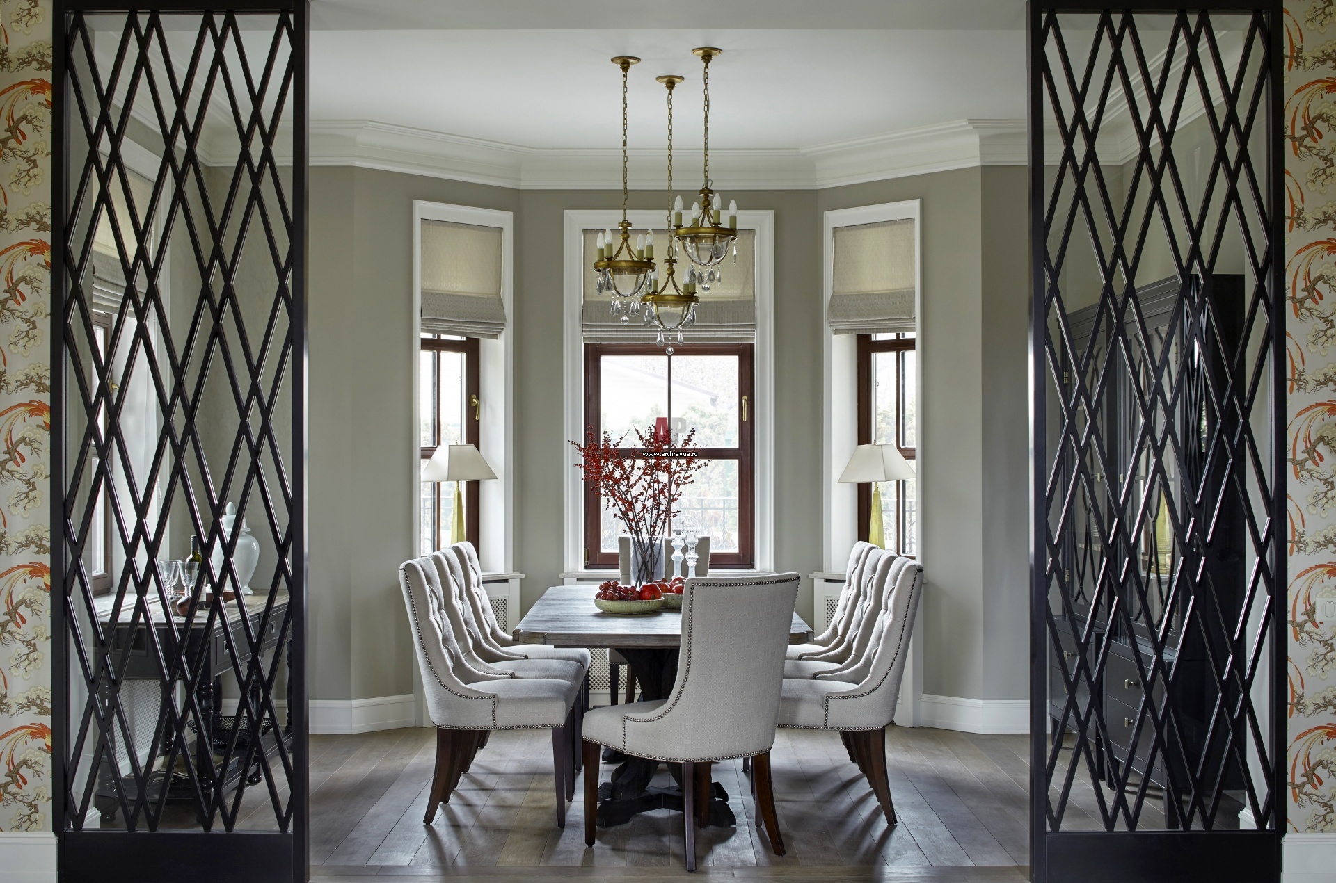 Зона столовой оформлена декоративными перегородками из дерева с графичным дизайном. Светильники, Visual Comfort & Co. Стол и стулья, Hooker.