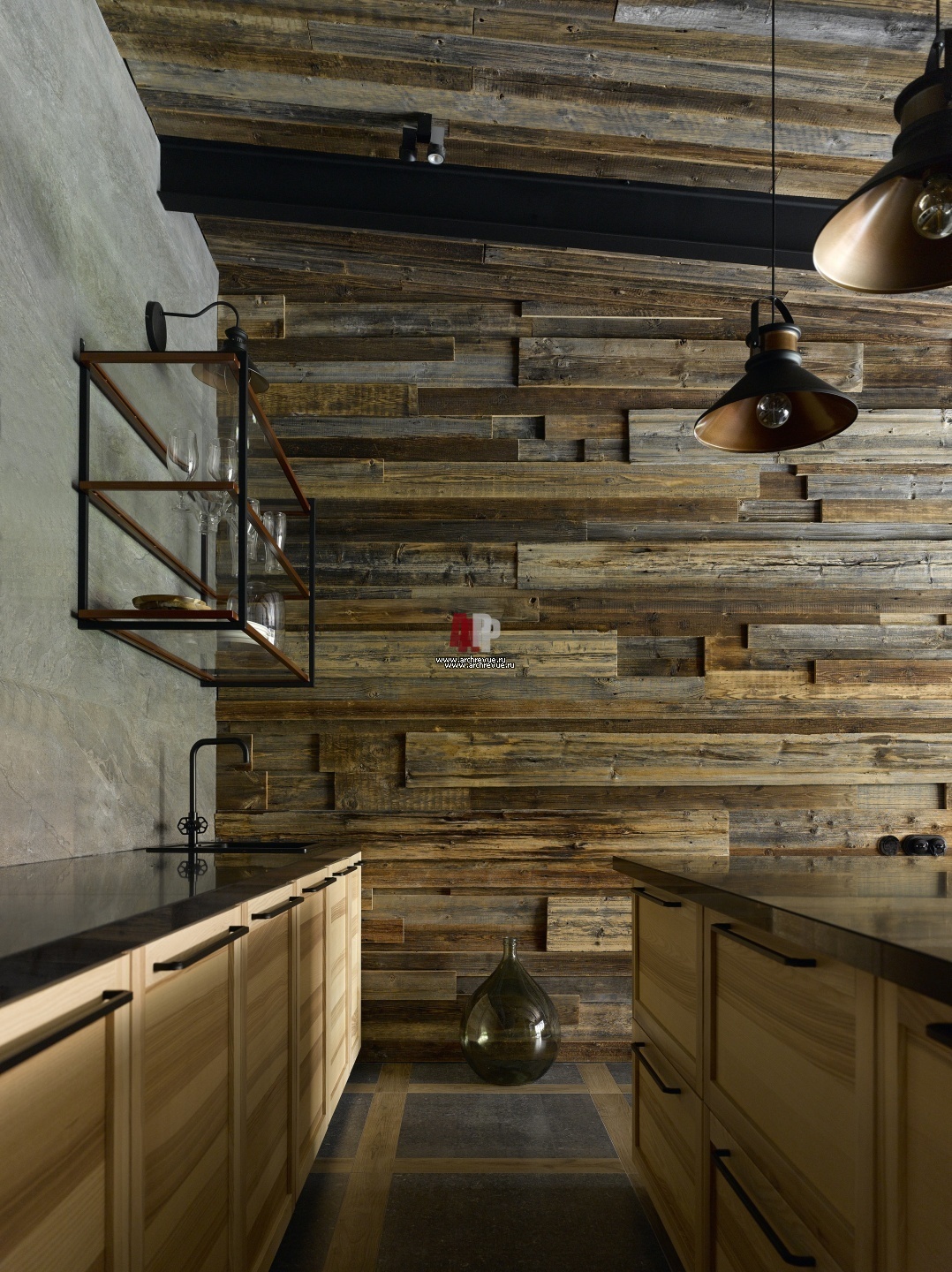 Стена за баром в гостиной домашнего СПА-комплекса зашита старой амбарной доской. «Сверху она ничем не обрабатывалась, это ее натуральный цвет. Очень красивый, уникальный материал с историей», - отмечает дизайнер Антонина Синчугова.