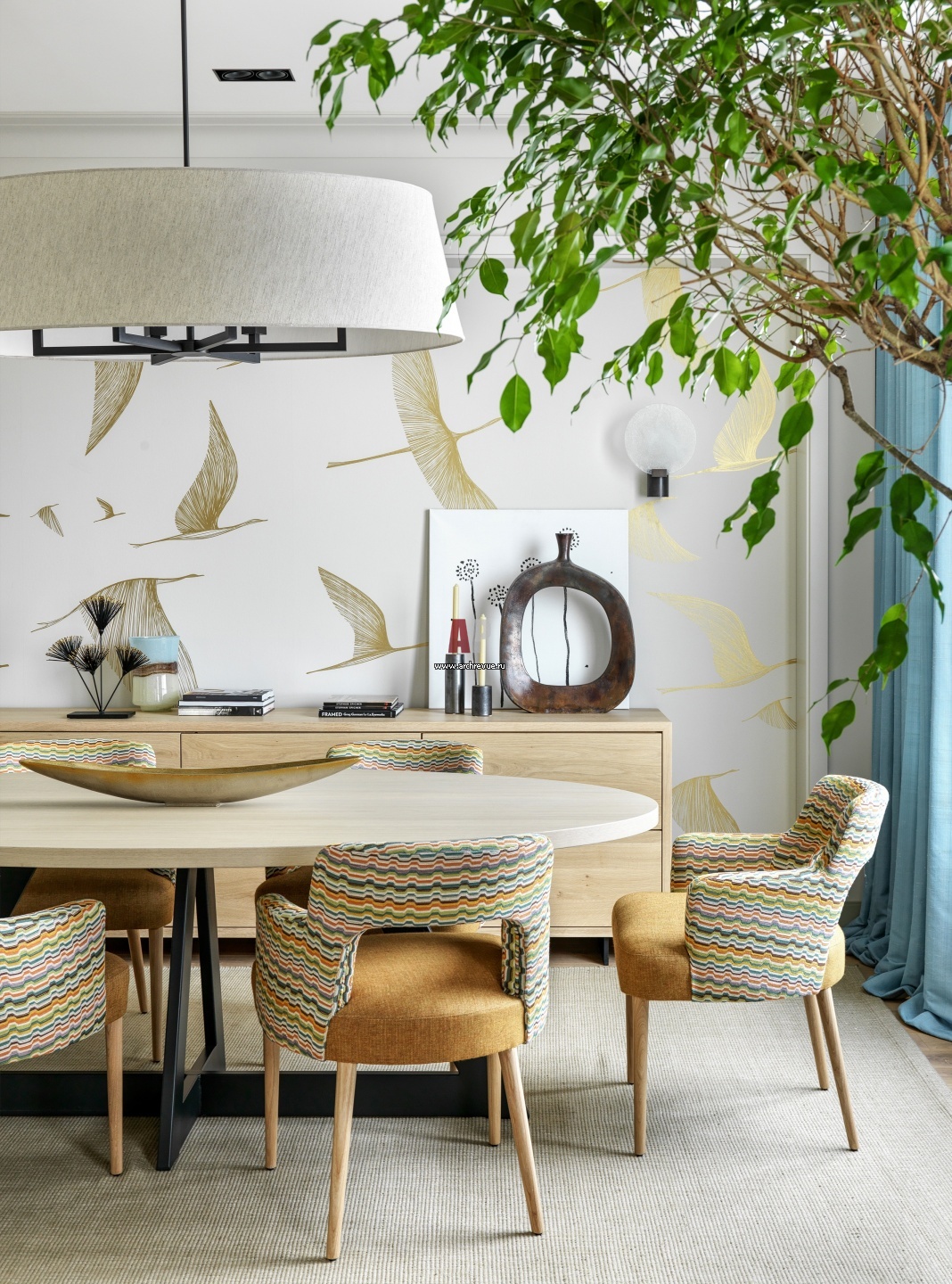 Светлая квартира в красках цветущего луга. Интерьер столовой. На обоях с ручной росписью изображены золотые журавли.