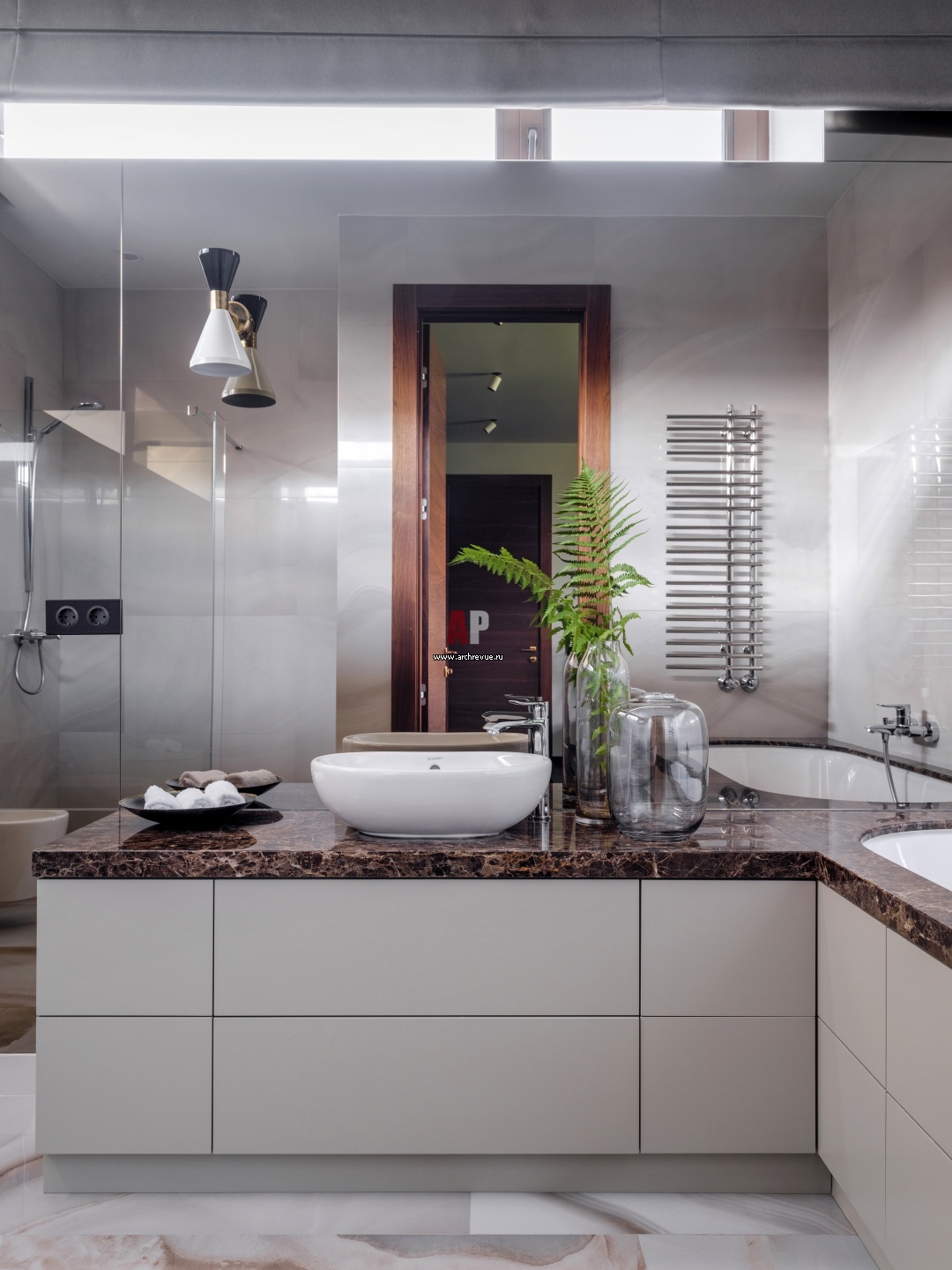 Стены главного санузла облицованы светлым керамогранитом. На полу – керамогранит Rex с фактурой под мрамор. Раковина, ванна, Duravit.