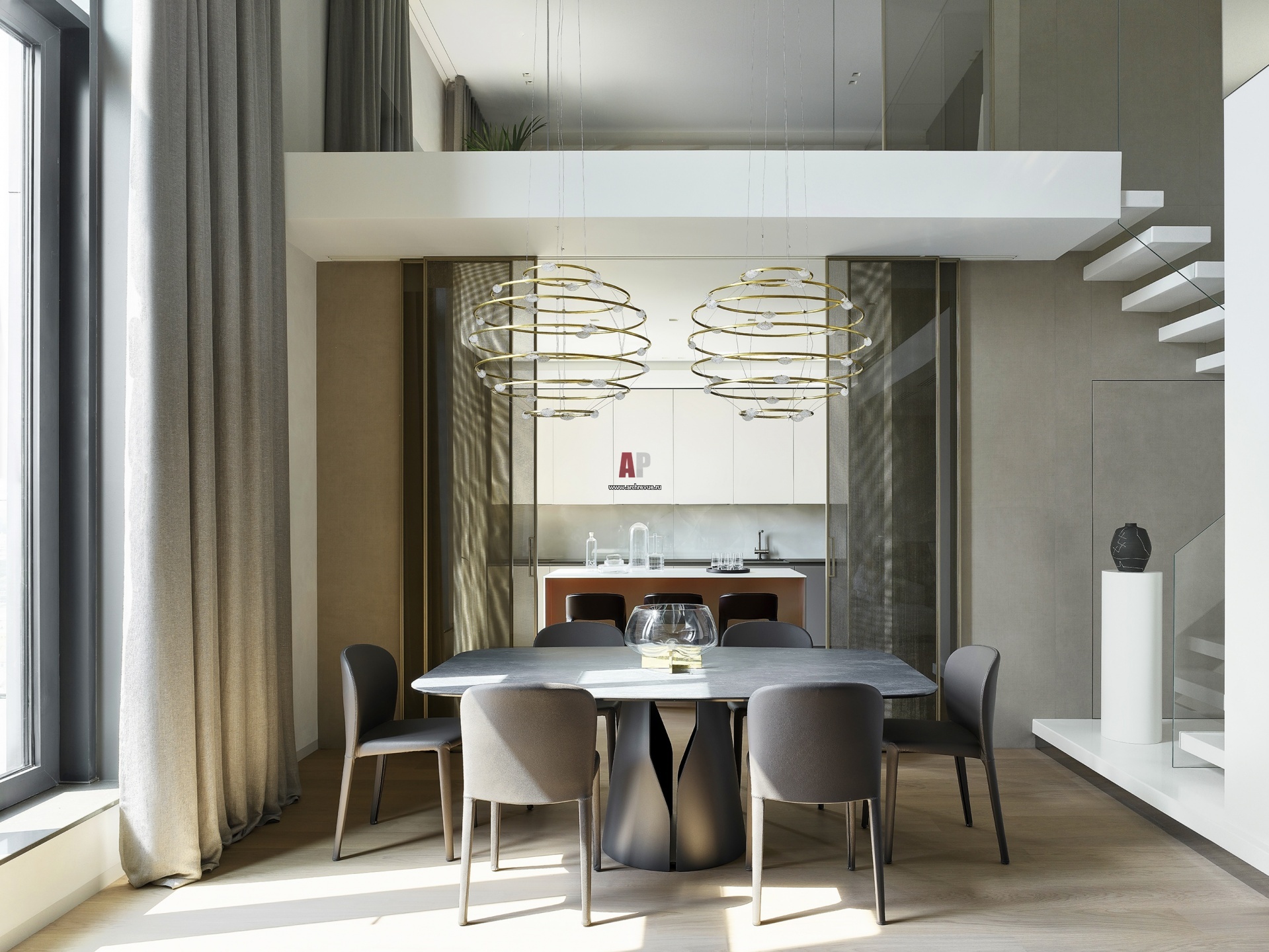 Столовая группа отделена от кухни стеклянными раздвижными дверями. Обеденный стол, Cattelan Italia, модель Giano Keramik. Парные подвесные светильники, Catellani & Smith, модель Petits Bijoux.