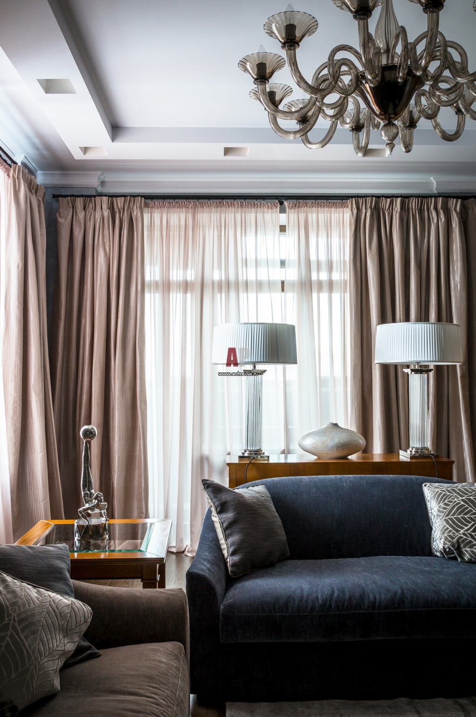 Квартира очень светлая. Поэтому дизайнеры исполнили стены в насыщенном сером цвете и использовали много источников рассеивающего мягкого света.