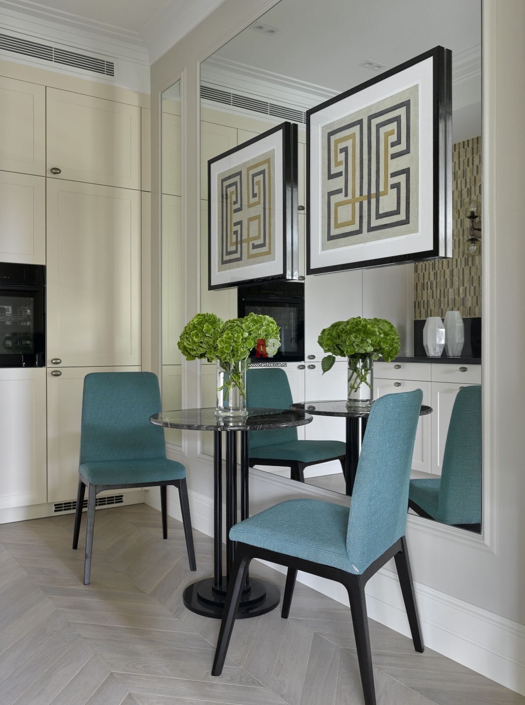 Компактная кухня выделена в отдельное помещение, без окон, но благодаря раздвижным дверям легко становится частью общего пространства. Зеркальная стена работает как световой фонарь и наполняет помещение отраженным солнечным светом. Стулья, BoConcept. Стол для завтраков, на заказ.
