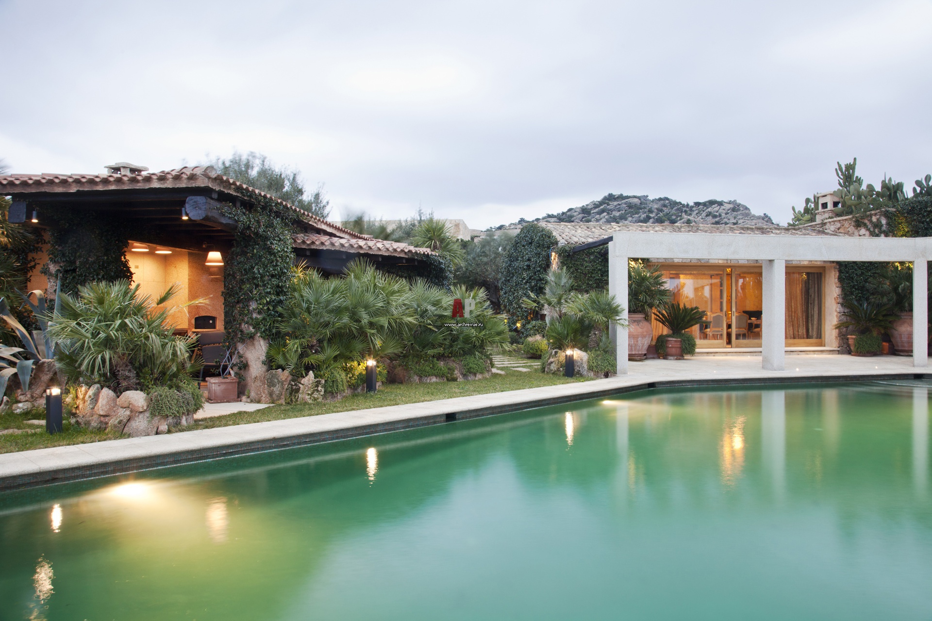 Вилла расположена на террасированном участке с двухуровневым открытым бассейном и видом на море. Слева от главного дома построен летний павильон с барбекю и печкой для пиццы.