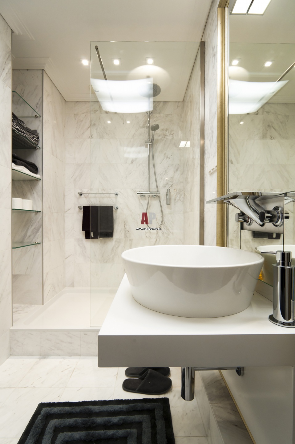 Фрагмент гостевого санузла. За стеклянной перегородкой – просторная душевая. Сантехника, Villeroy & Boch. Смесители, Axor. Душ, Hansgrohe.