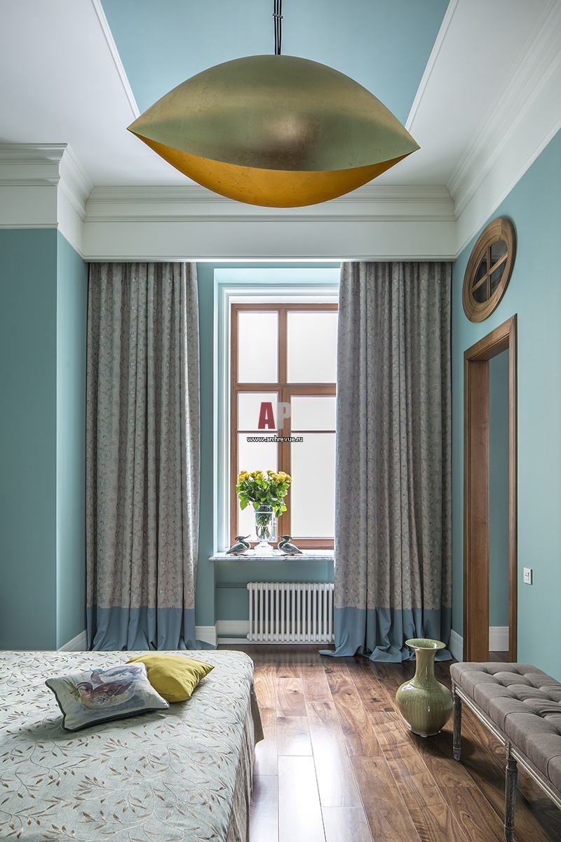 Интерьер хозяйской спальни выполнен в ярких бирюзовых тонах. Светильник Catellani & Smith из металла в форме ока.