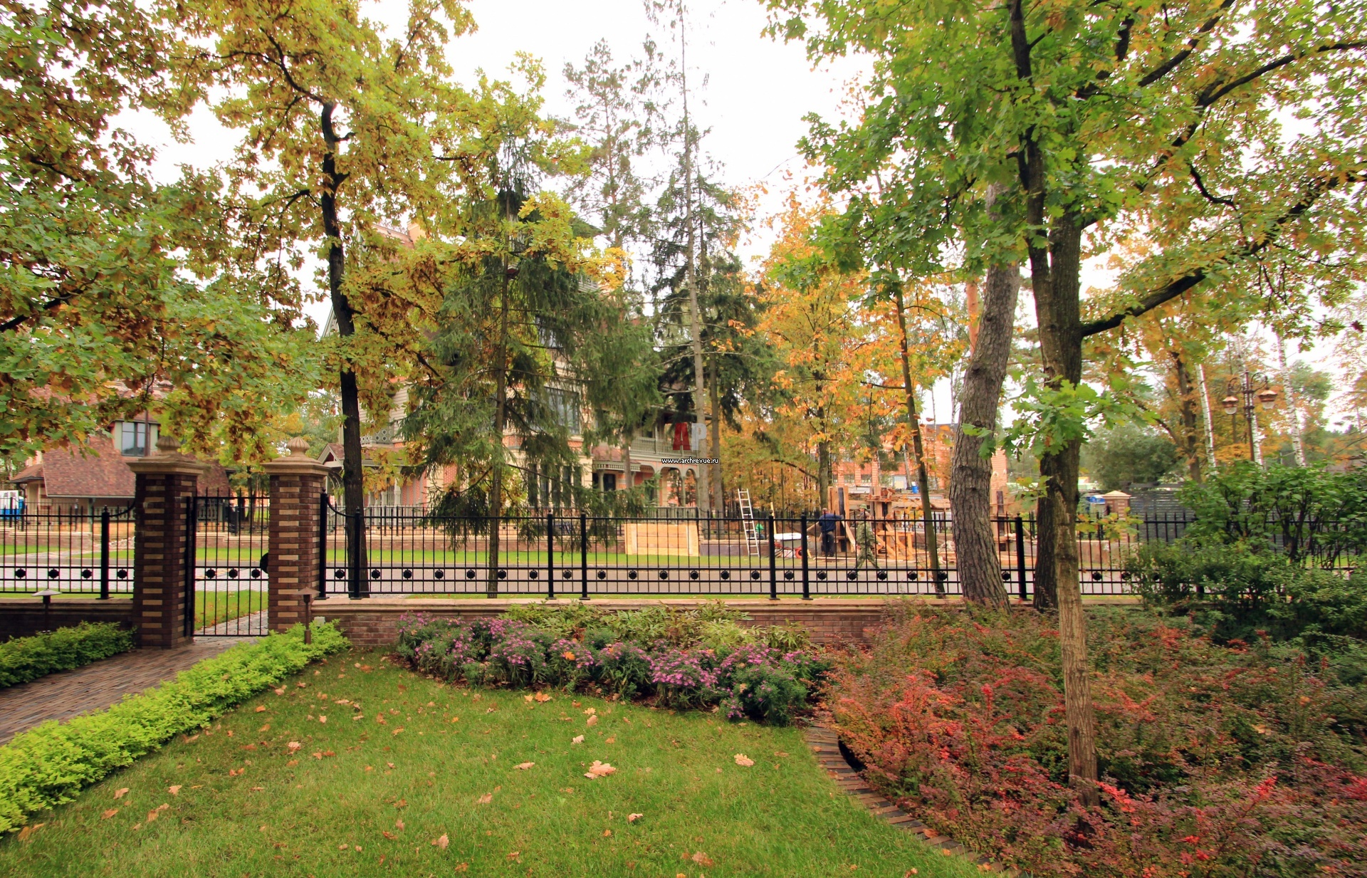 Чтобы сохранить многолетние дубы у входа, пришлось вокруг них сделать понижение с клинкерным обрамлением. Импровизированную клумбу засадили кустарниками барбариса с красной листвой.