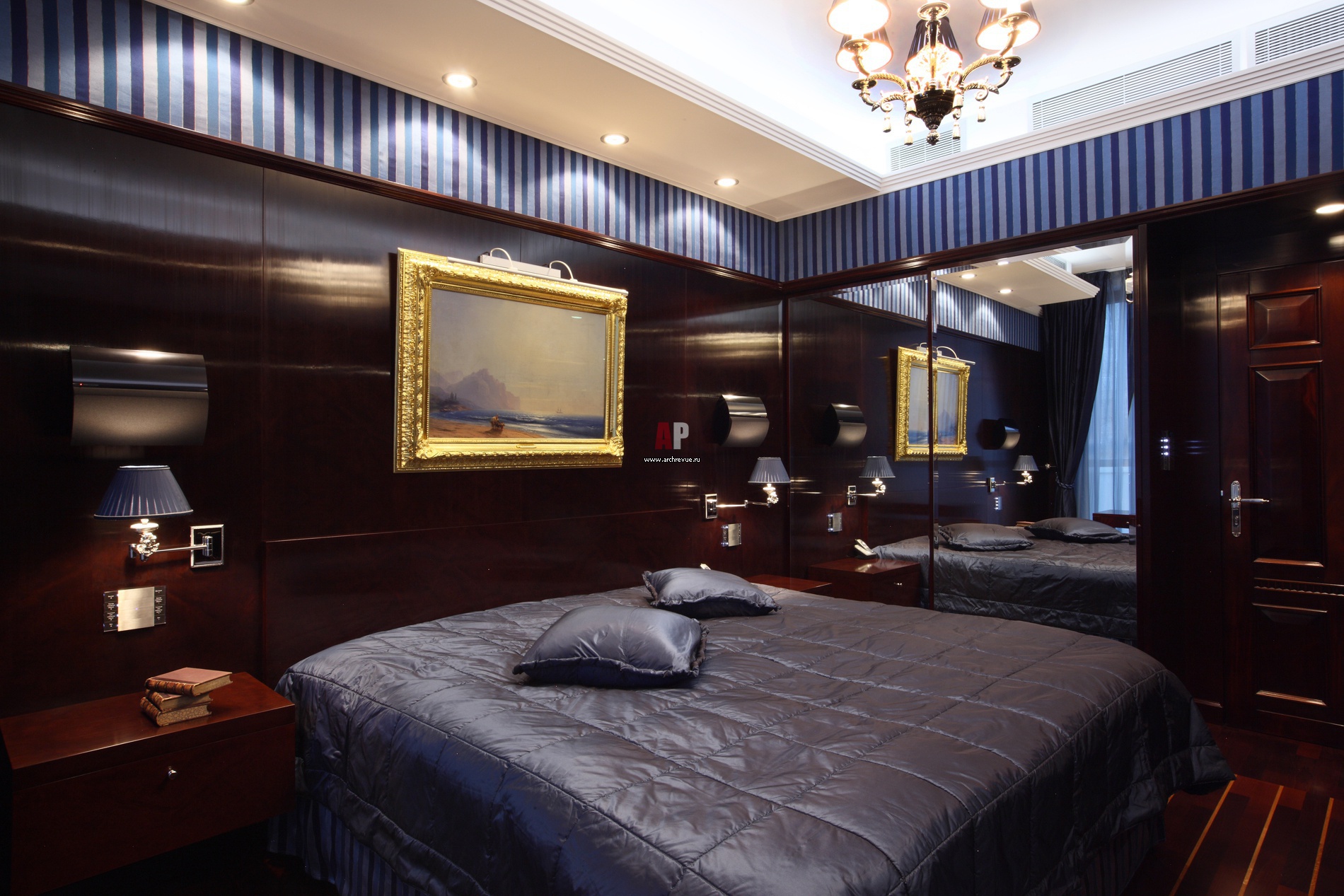 Спальни в квартире решены в традиционном консервативном стиле. Стены зашиты панелями из редких сортов дерева. Гардеробные встроены в ниши и декорированы зеркалами.