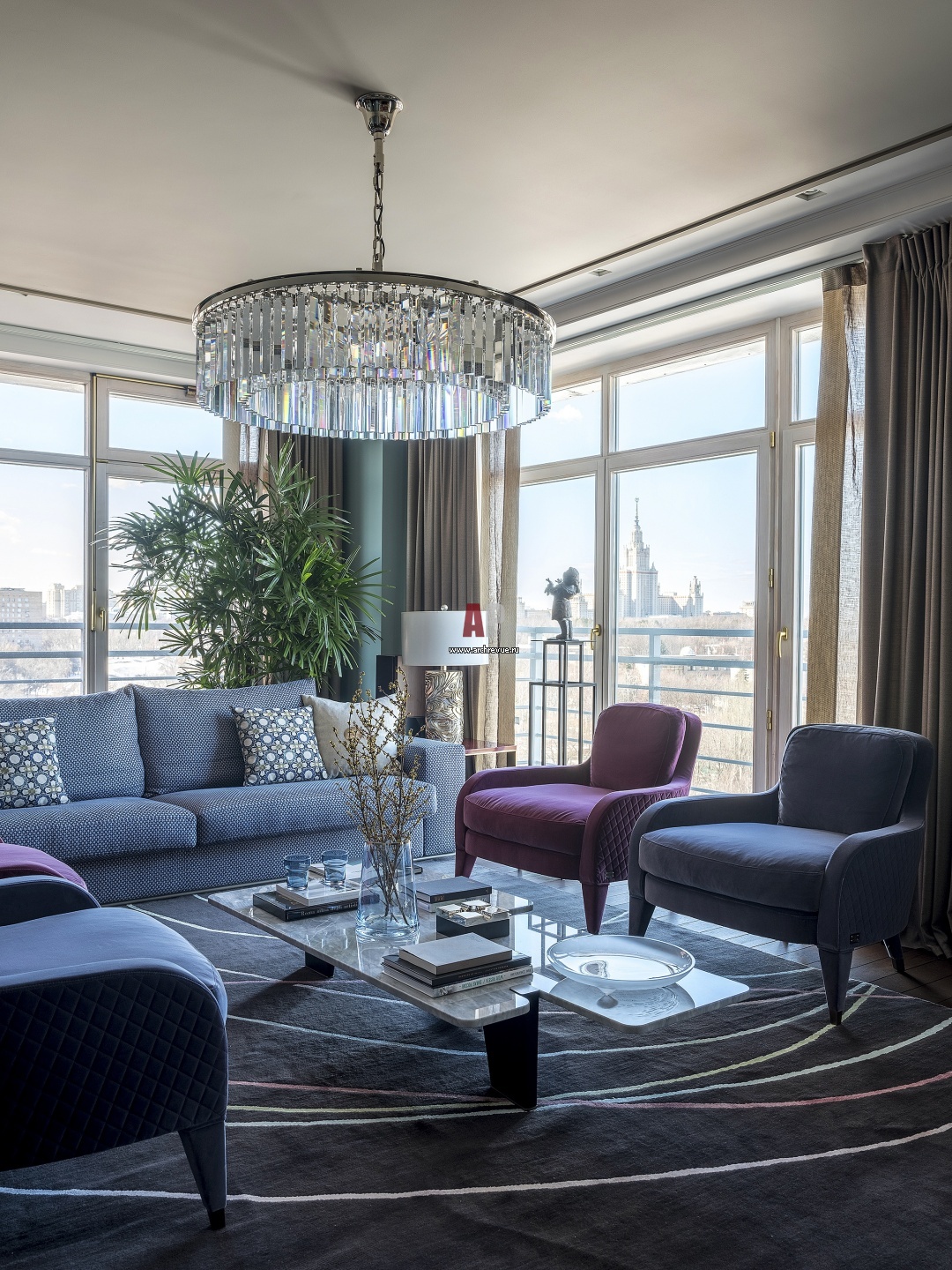 В пластике декоративных предметов видна связь с городской панорамой. Например, металлический постамент для скульптуры Олега Закомарного «Девочка и снег» в гостиной выполнен в виде ступенчатого объема и перекликается с архитектурой сталинской высотки МГУ.