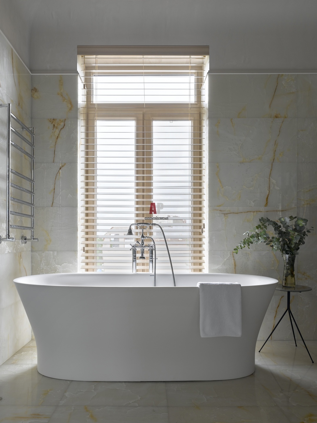 На втором этаже находится четыре ванные комнаты, и в каждой из них есть окно. Стены и пол хозяйского санузла облицованы ониксом. Сантехника, Duravit.