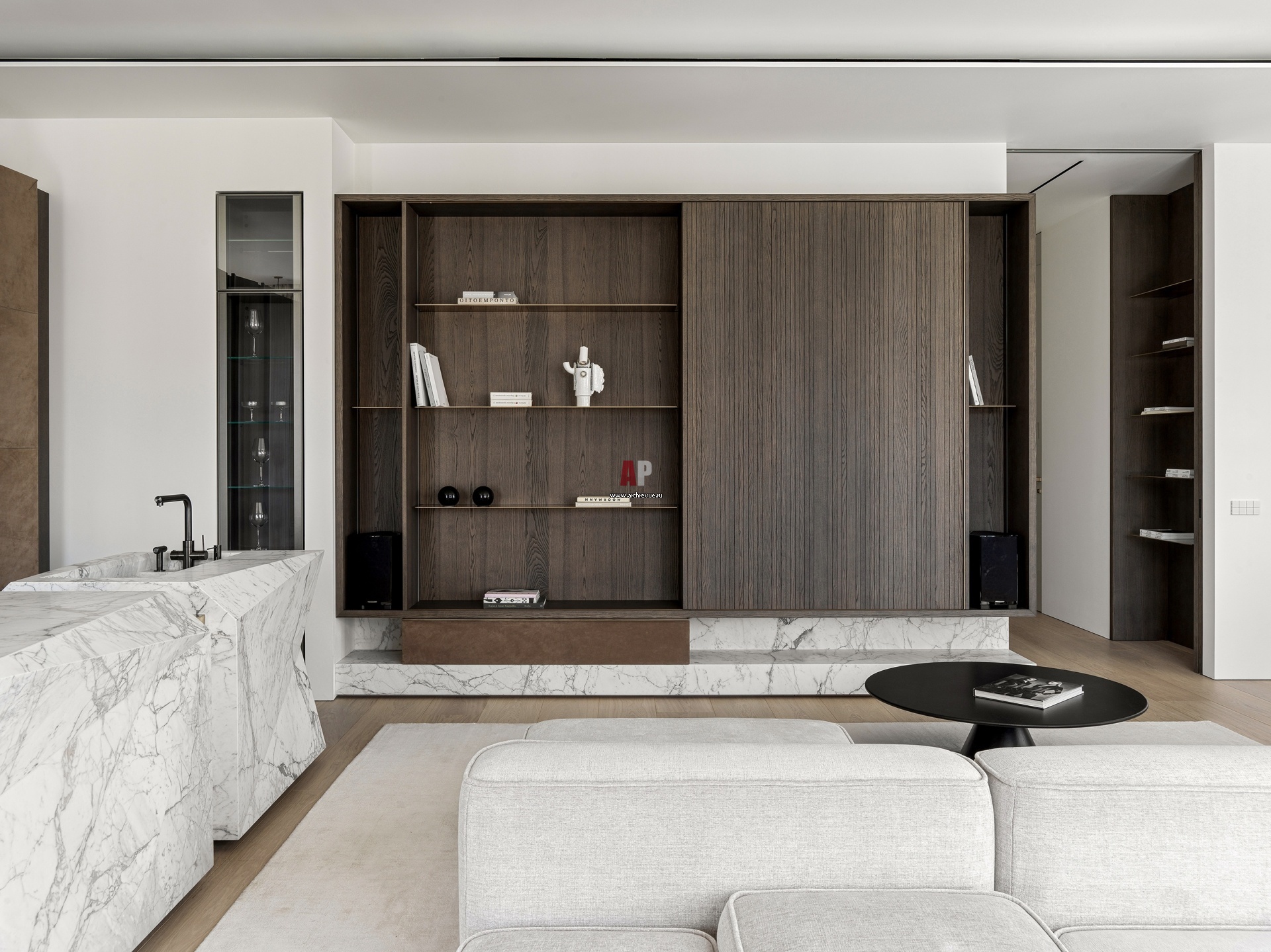 Квартира в стиле минимализм для молодой семьи. Интерьер гостиной. ТВ-экран скрыт за раздвижной панелью.