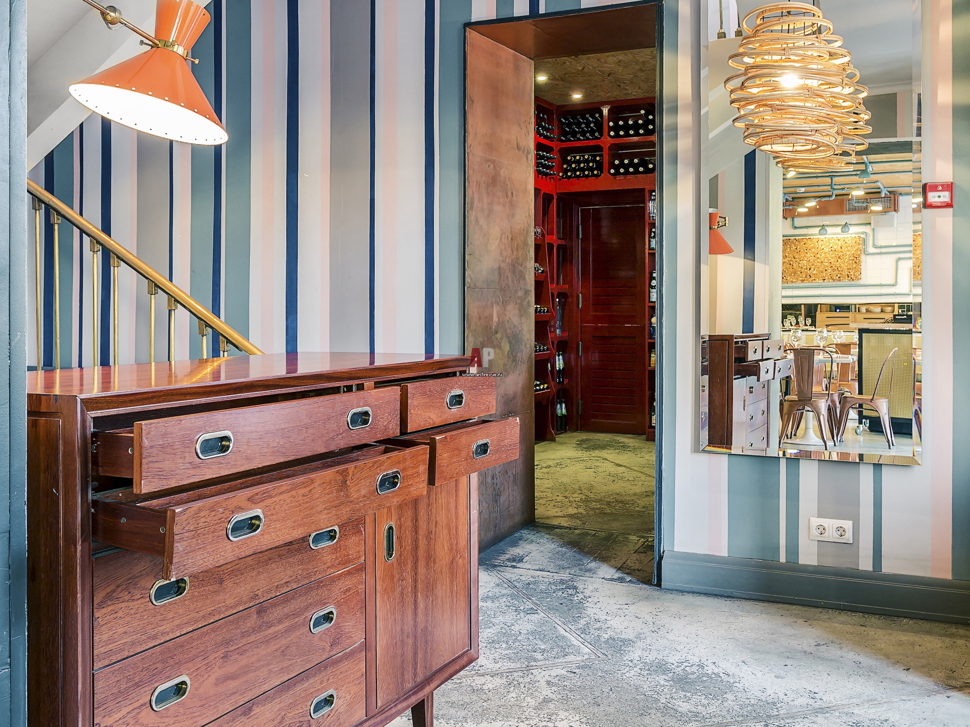 Интерьер входной зоны. Под стойку хостес адаптирован винтажный комод с микро-ящиками для визиток. Справа от холла находится винный магазин с баром и алым винным стеллажом. Пол из наливного бетона.