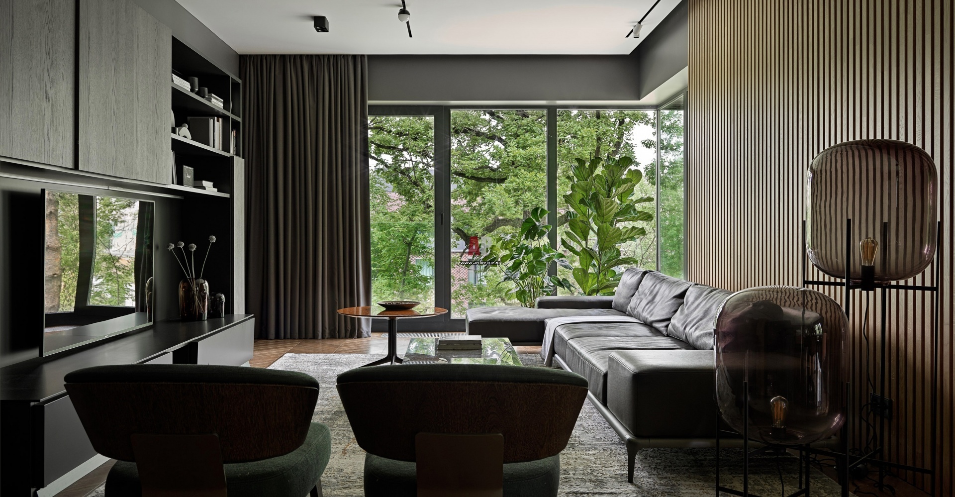 Гостиная. Одна стена декорирована панелями с имитацией реек 4 см в ширину и 2 см в глубину. Диван, система хранения и журнальный стол, Poliform. Кресла Minotti, модель Kreed Wood. Напольные светильники, Brokis.