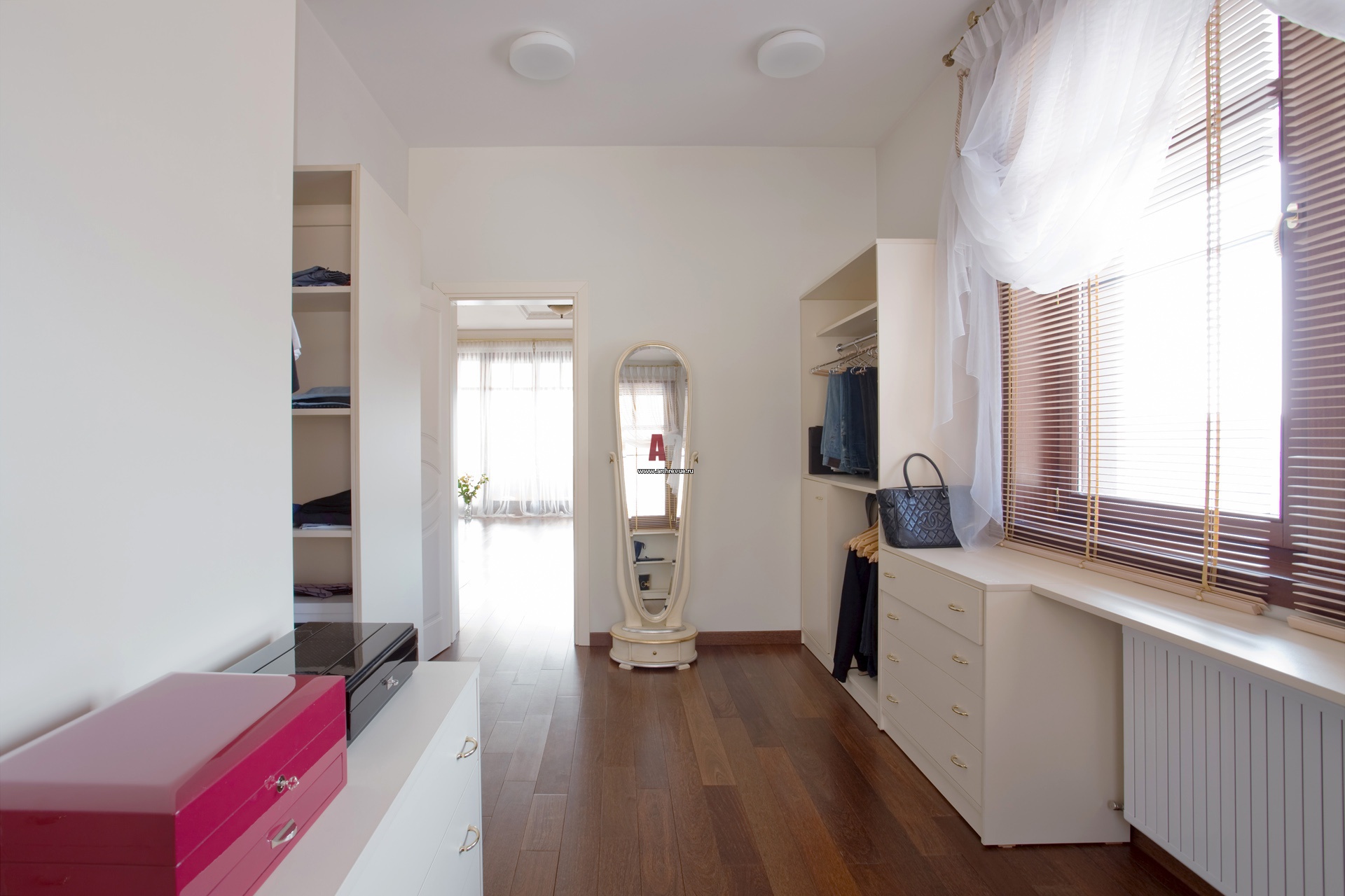Фото гардеробной комнаты с окном. Просторная современная гардеробная меблирована комодами и стеллажами для хранения вещей из дерева с белым эмалевым финишем.