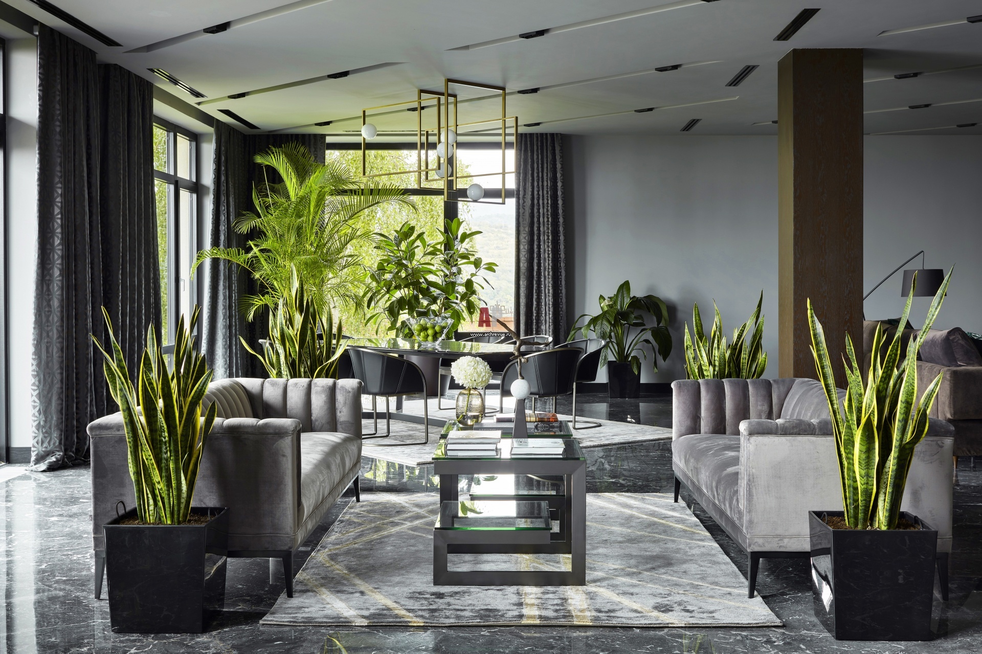 Зона отдыха в серых тонах в общей гостиной. Спокойный интерьер усложняет «пульсирующий» ритм встроенных в потолок светильников. Природную тему подчеркивают живые растения в горшках и кадках, которые установлены почти во всех помещениях.