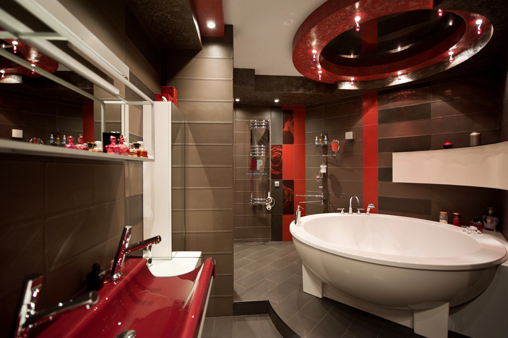 Интерьер ванной комнаты в квартире в стиле гламур. Круглая ванна размещена на подиуме. Над ней – подвесной потолок, отделенный красной декоративной штукатуркой. В центре – круглый натяжной потолок черного цвета с зеркальным блеском.