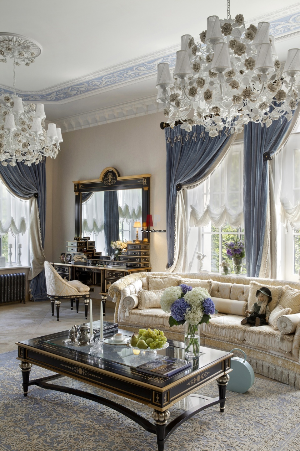 Дамский будуар в дворцовом стиле. Люстры VIllari с фарфоровыми розами.