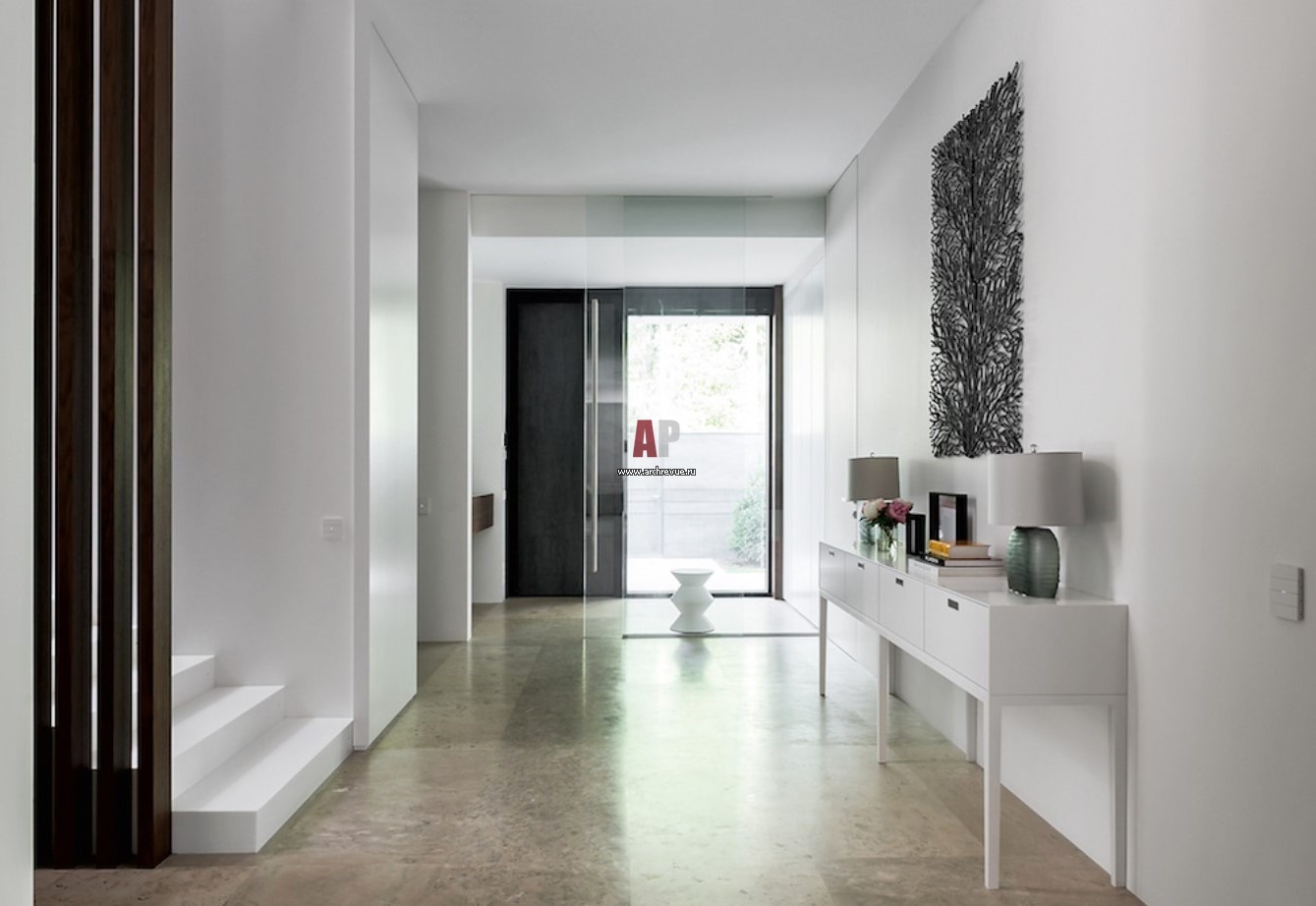 Дом с современной архитектурой в Жуковке. Стены в прихожей-холле белые, на полу – керамогранит. Раздвижные стеклянные перегородки без рам. Консоль, B&B Italia. Светильники, Arteriors.
