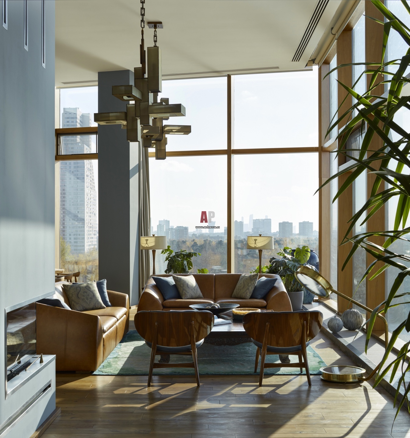 Двухэтажная квартира с видом на водохранилище и вторым светом. Кожаные диваны сделаны на заказ. Подвесные светильники, Fine Art Lamps. Торшер, Ceccotti. Аксессуары, Woon Stores.
