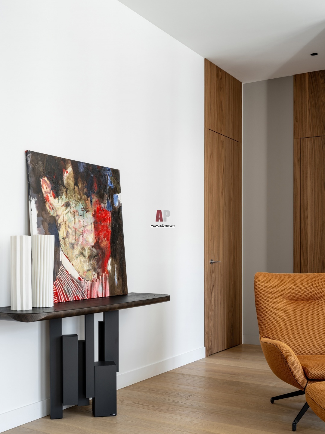 Гостиная. Межкомнатные двери с наличниками-фрамугами до потока из шпона ореха, Trino Porte. Консоль, Cattelan Italia. Картина Александра Жерноклюева, «Метафизический портрет. Мужчина в полосатом пиджаке», 2016, холст, масло. Авторская керамика Елены Завацкой.