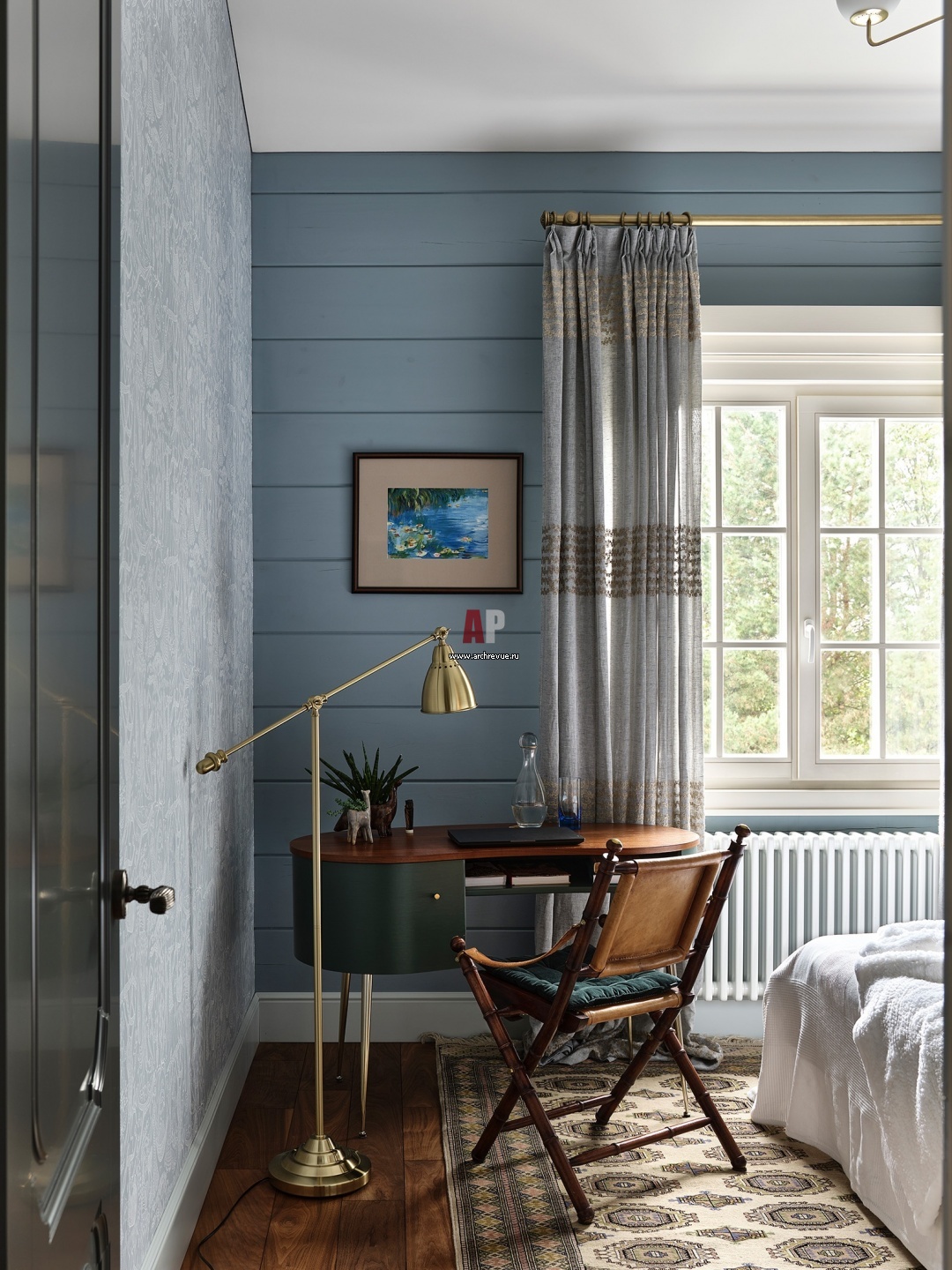 Интерьер деревянного дома в традициях русской усадьбы. Рабочая зона в гостевой спальне.