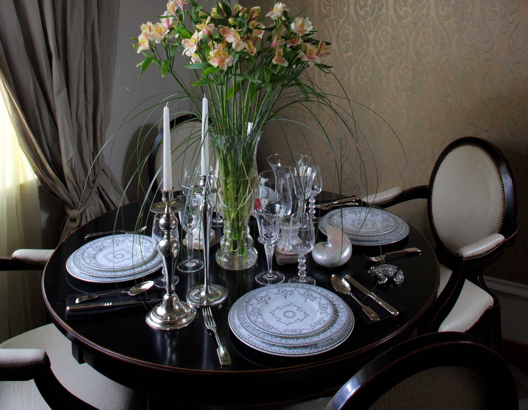 Особенное внимание было уделено посуде: тарелки, бокалы – VALENTINO; серебряные столовые приборы – ROBBE&BERKING; подсвечники, фигурка лягушки - RITA JORDENS.