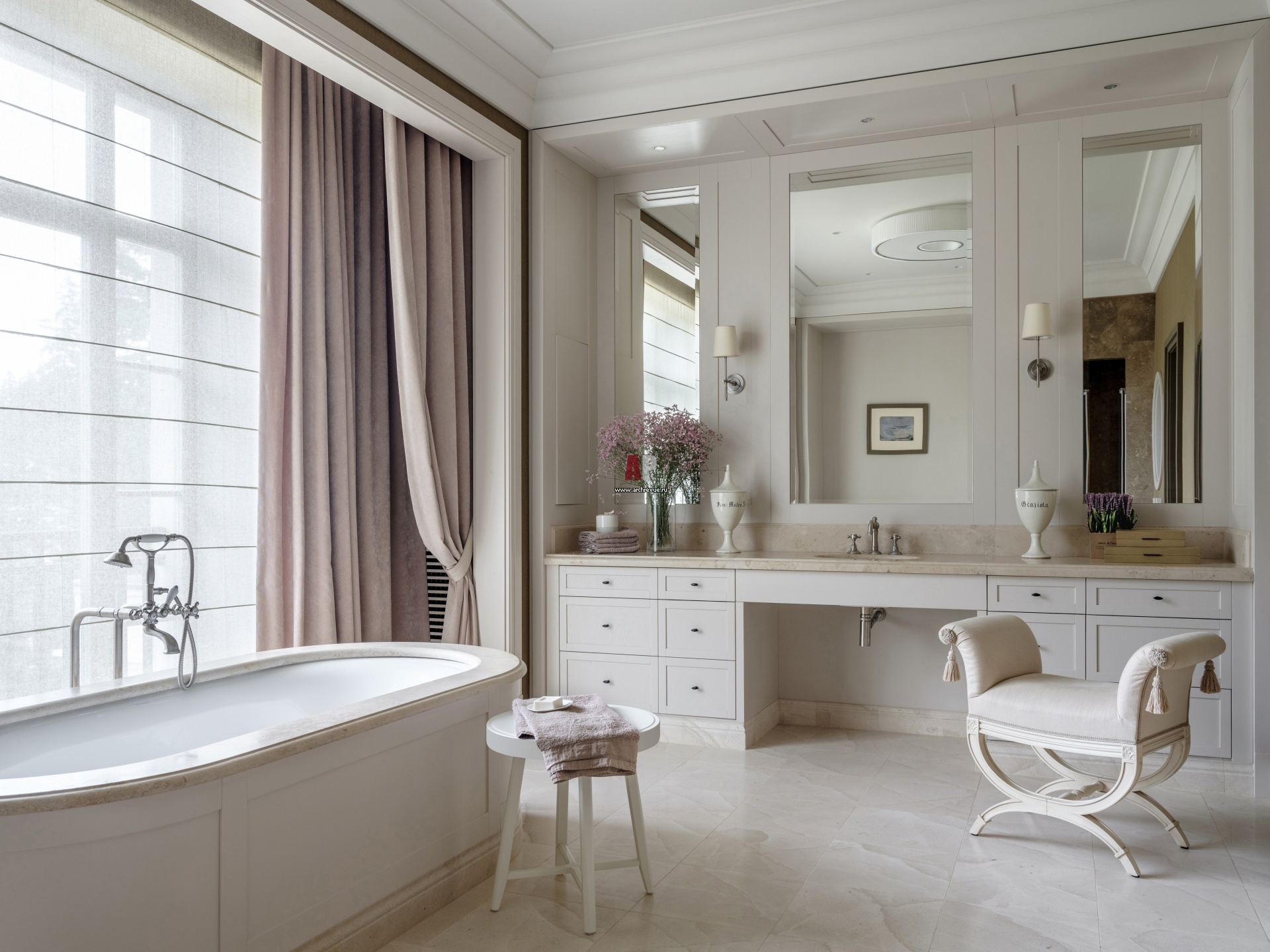 Женская ванная комната выполнена в нежной, пудровой цветовой гамме. Мебель сделана на заказ. Столешница умывальника выполнена из бежевого мрамора. Камень на несколько тонов светлее уложен на полу. Над умывальником сделано трехчастное панорамное зеркало. Сантехника, Villeroy & Boch.