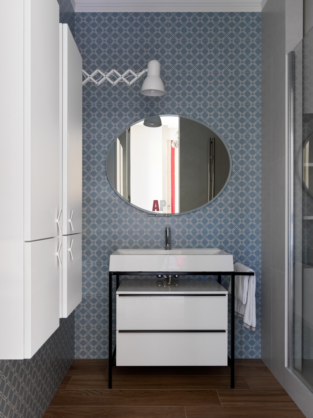 Детская ванная комната решена в серо-голубой палитре.