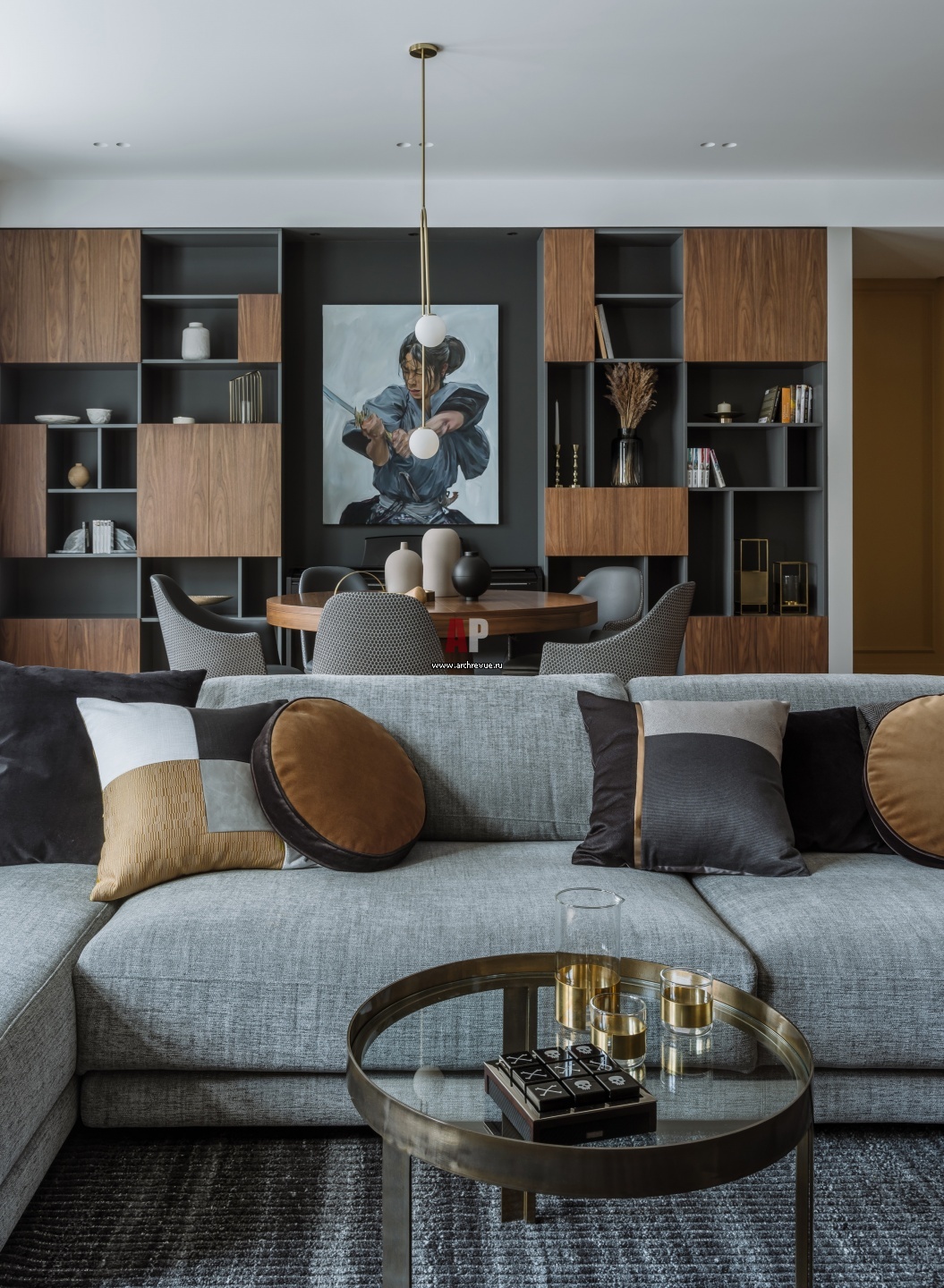 Настроение в общей гостиной задают стеллажи, выполненные на заказ по эскизам дизайнера из шпона ореха в комбинации с темной эмалью. Картина «Самурайка» работы Константина Федорова.