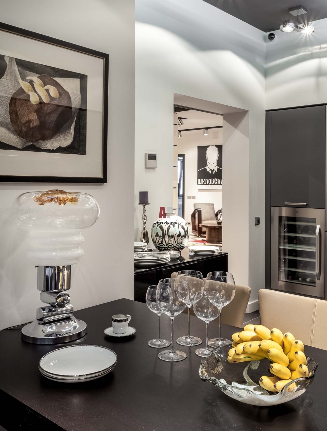 Интерьер кухни выполнен в монохромной цветовой палитре. С темными кухонными фасадами гармонирует обеденный стол из черного дерева и «фартук» из серого гранита. Стулья обиты бежевой кожей.