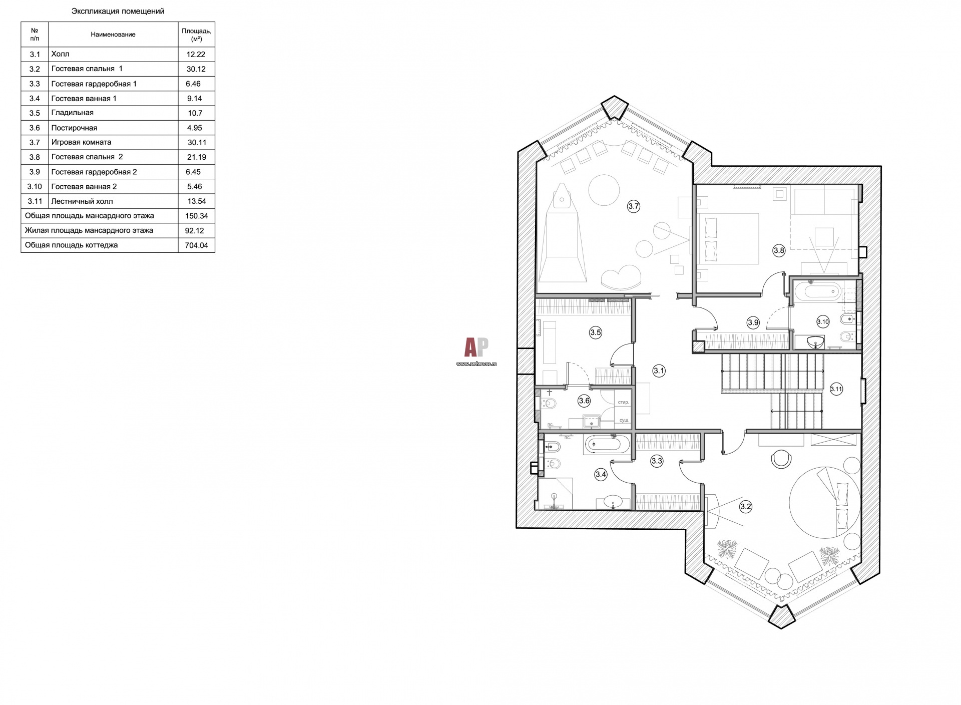 Планировка 3 этажа 3-х этажного дома с мансардой для большой семьи.