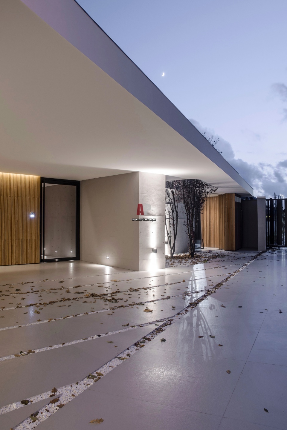 Дом-павильон с внутренним двором и открытым бассейном. Глухой уличный фасад с подъездной территорией и гаражом.