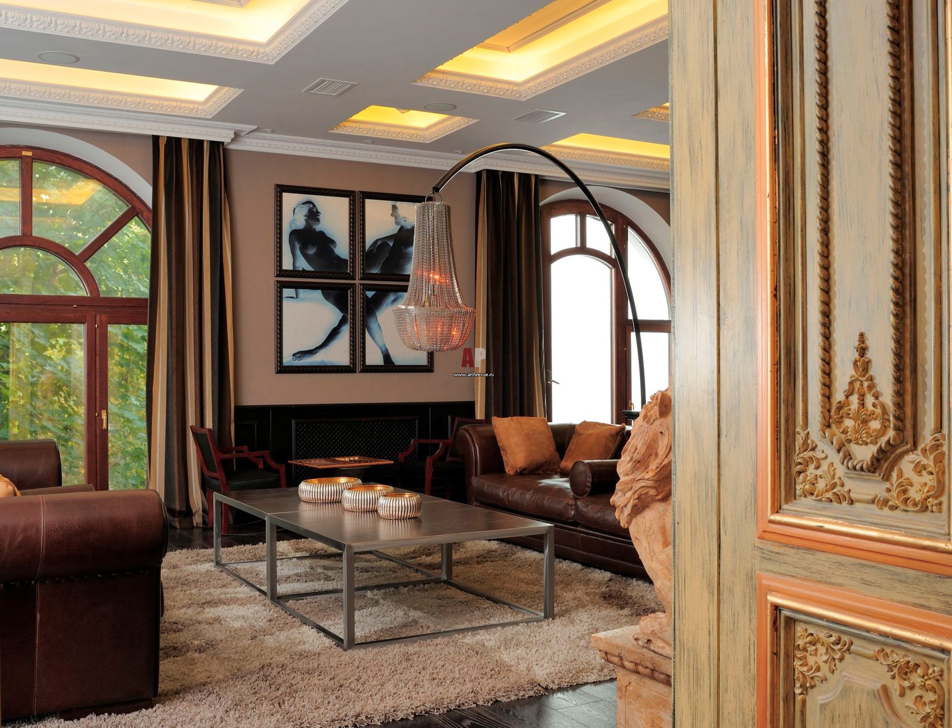 Парадные двери изготовлены по эскизам дизайнеров и покрыты несколькими слоями золотой патины. Напротив них – роскошные арочные окна.