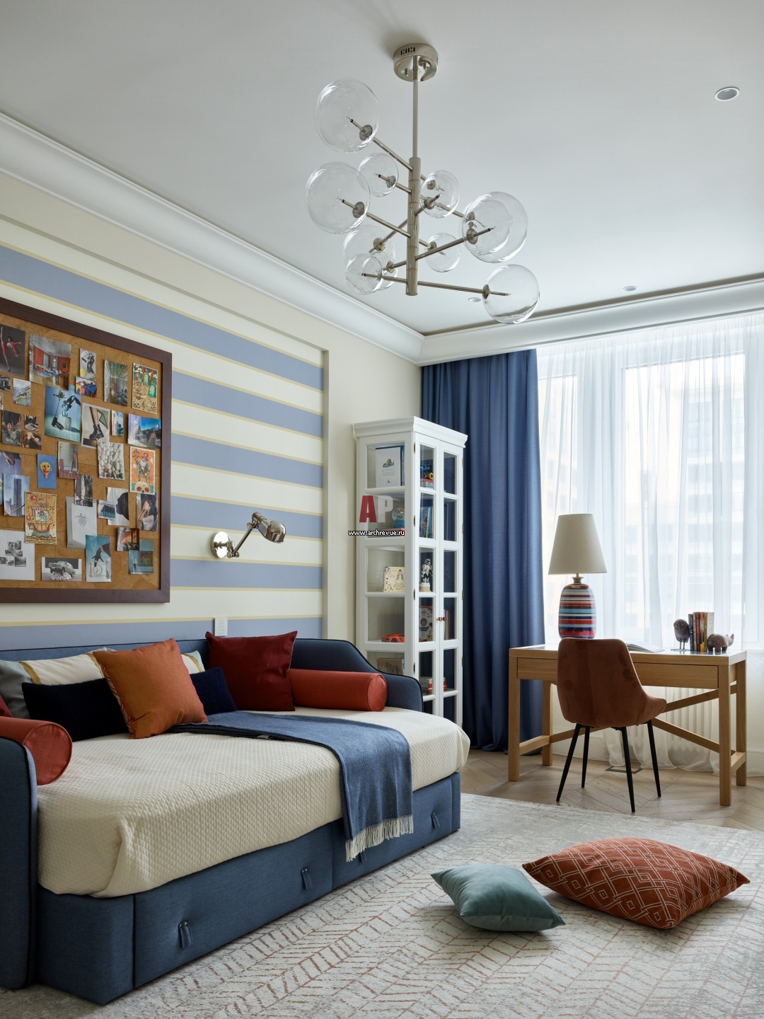 Спальня сына выполнена в прохладной сине-голубой палитре. Это любимый цвет юного хозяина, и тот оттенок, который помогает концентрироваться. Кровать, Manifesto. Бра, Hudson Valley Lighting. Люстра, Arteriors.