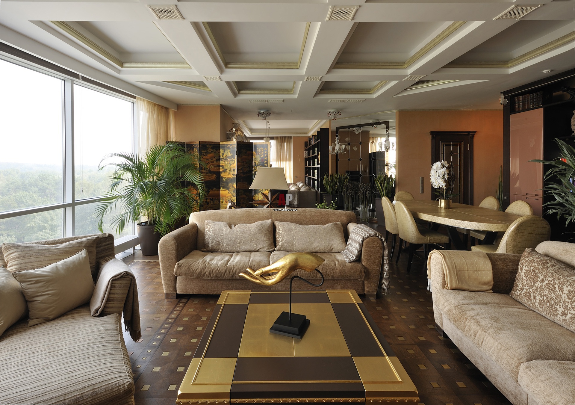 Квартира обращена окнами в парк. В интерьере природную тему продолжают кадки с живыми растениями и цветами. Ширма в стиле ар-деко приобретена хозяйкой квартиры. Двери с витражами выполнены на заказ, изготовитель «Александрийские двери».