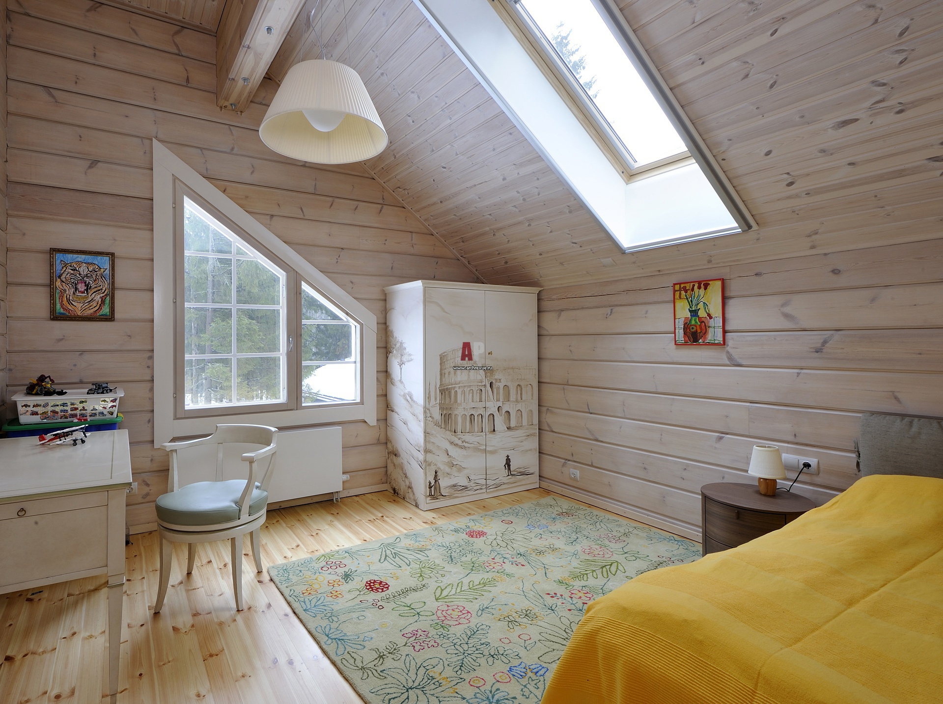 Фото интерьера детской в мансарде второго этажа деревянного дома.