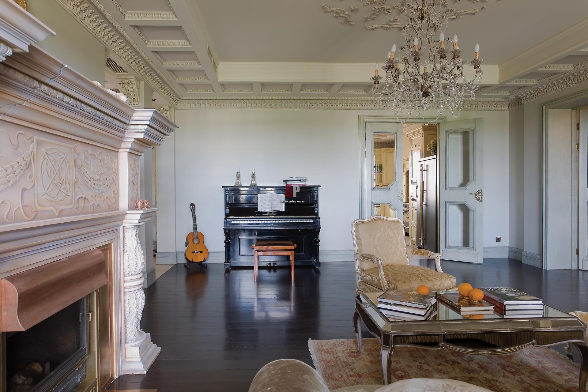 Камин, расположенный в гостиной, украшает богатый лепной декор, ставший продолжением лепного оформления потолков. Убранство комнаты как в зеркале отражается на полу из массивной дубовой доски, поставщик «Элит-Декор»
