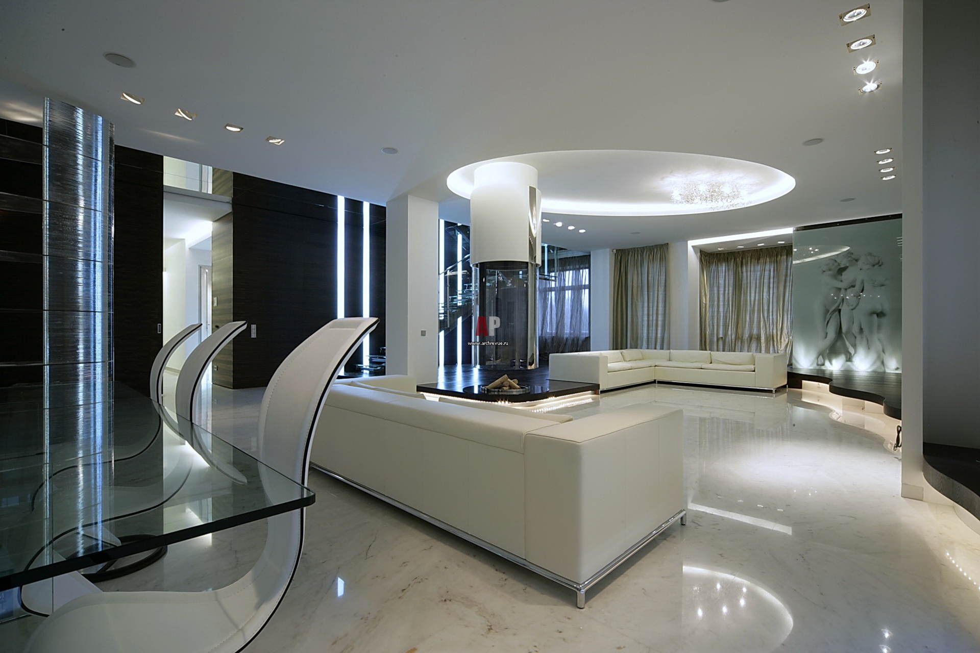 Пол гостиной облицован крупными плитами мрамора. По всей площади установлен подогрев. Белые диваны, De Sede.