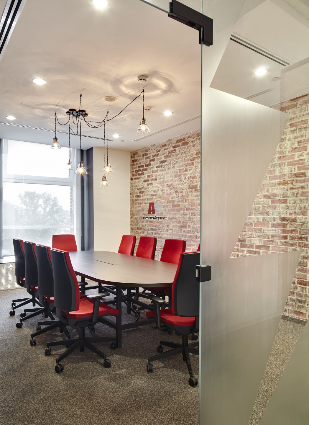 Фото интерьера малой переговорной. Архитекторы сохранили существующую кирпичную кладку. Потолочный светильник в стилистке индустриального лофта.